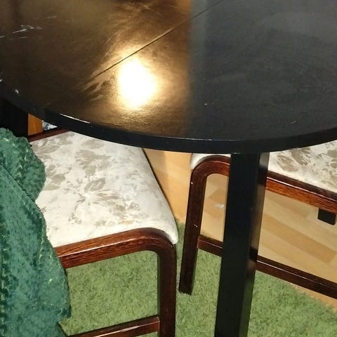 Myydään kuvan pyöreä ruokapöytä. Halkaisija 105cm. Hyvässä kunnossa lukuunottamatta kuvissa näkyvää yhtä pientä kolhua.