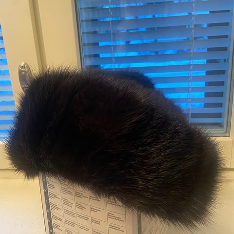Kaunis ruskea minkki turkis hattu. Pystyy myös avaamaan takaa ja laskemaan (piilo hakas kiinnitys), 56 cm ympärys. Tekijä : Melvin Turkistupa, Himanka. Päällys osa mustaa nahkaa.