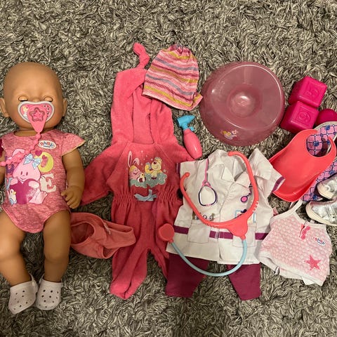Baby Annabell -nukke ja kuvissa näkyvät tarvikkeet. Leikitty, ja joitain käytön jälkiä, mutta siisti edelleen.