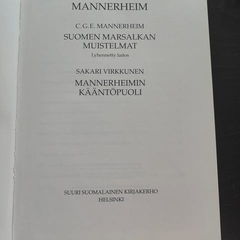Myydään uudenveroisessa kunnossa oleva hieno kirja Suomen marsalkka Mannerheimista. Sisältää kaksi eri kirjaa samoissa kansissa. Kirjassa on myös kirkas muovinen irrotettava suojakansi. 527 sivua.