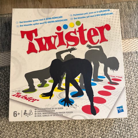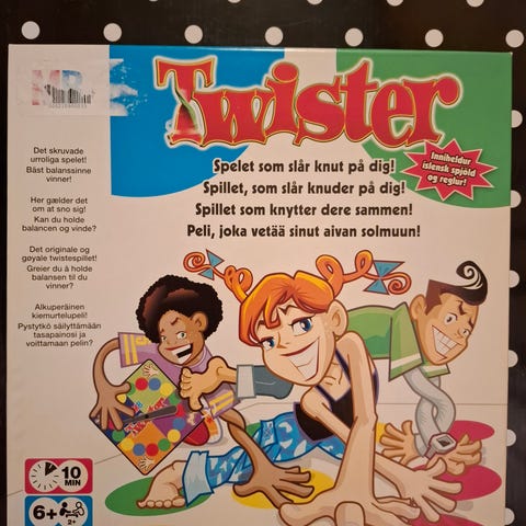 Myynnissä Twister lautapeli sisältäen pelialustan, värilliset pelimerkit ja ohjeet. Sopii moneen eri tilaisuuteen lasten juhlista polttareihin.