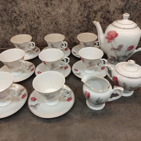 Kultareunainen nostalginen ruusukuvioinen posliinikahviastiasto juhlahetkiin.