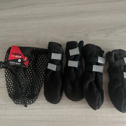Rukka Pets fleece boots -koiran tossut, koko 5, musta väri, materiaali fleece. 4kpl tossuja, vain kokeiltu ja todettu isoiksi.