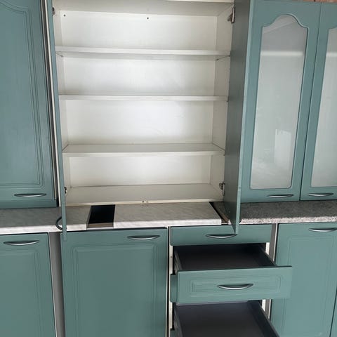 Ikkunaseinän kokonaisleveys 400 cm ja oikeanpuoleisen 280 cm. Erillisen lasikaappiosion leveys on 160 cm. Kuvissa ei näy pakastimen ja jääkaapin päällä oleva kaappi kokonaan. Mukaan saa koneista uunin, lieden, liesituulettimen ja mikron sekä altaan, hanan ja valot. Puretaan viikolla 6.