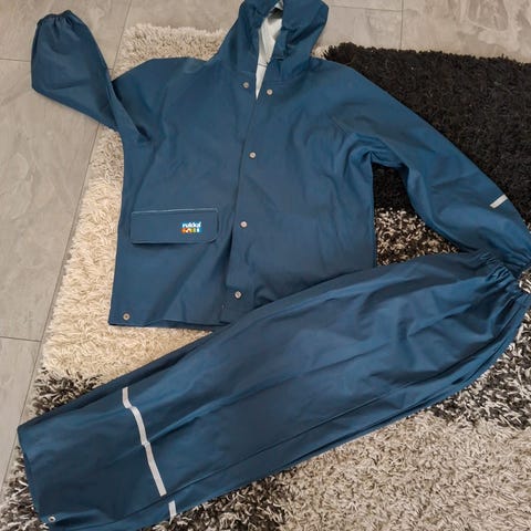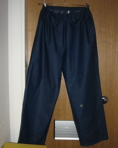 Tummansiniset Rukka sadehousut, käyvät 152 cm pojalle tai miksei myös työllekin. Sisällä olleeseen lappuun on nimikoitu tussilla edellisen omistajan sukunimi. Muuten sadehousut ovat ehjät ja vastaavat uusia housuja.