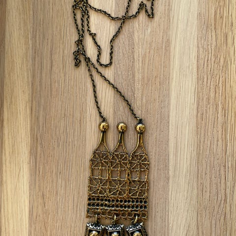 Pentti Sarpanevan suunnittelema pronssinen riipus. Riipuksen koko 3.6 cm x 4.4 cm. Ketjun pituus 62 cm. Leimat: BRONZE FINLAND, P.SARPANEVA.