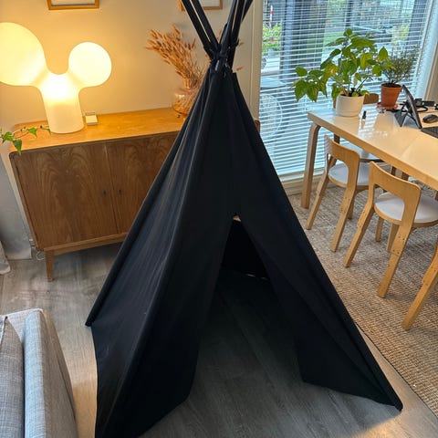 Myydään suoraan käytöstä lasten tiipii. Täällä on leikitty ja luettu kirjoa. Kerettiin purkamaan ja laittamaan kasaan, joten ei tullut omaa kuva otettua tiipiistä. Pohjakankaassa on muutama tahra, joten pesukoneen kautta kannattaa käyttää tai pestä rätillä.
