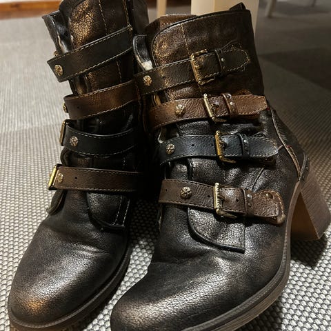 Vetoketjut hyväkuntoiset ja ehjät, vuori kengissä siisti, pohjakuvio hyväkuntoinen. Pieni kosmeettinen haitta vetoketjussa.