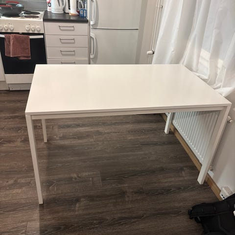 IKEA pöytä, jossa on puupintainen kansi ja valkoiset jalat. Sopii monenlaiseen käyttöön esimerkiksi työ- tai ruokapöytää. Nouto Tyksin läheltä. Saa tarjota