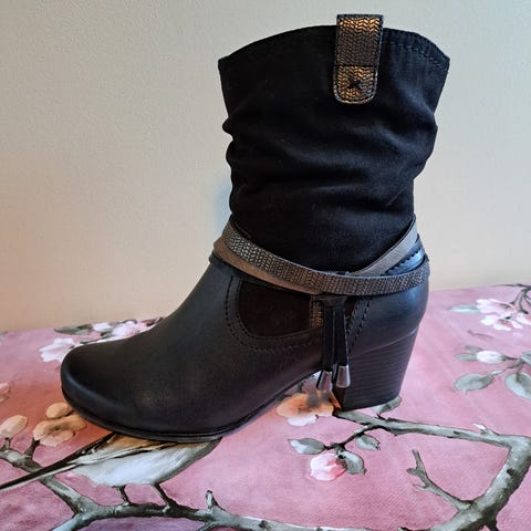 Vähän käytetyt Janina F nilkkurit. Korko 5.5 cm. Edessä koristeellinen metalliverkko, sivulla solki. Sisäsaumassa vetoketju. Kangasvuori. Erittäin hyvät kävellä. Nouto Länsimäestä n. 500 m Mellunmäen metroasemalta tai postitus. Ostaja maksaa postituskulut.