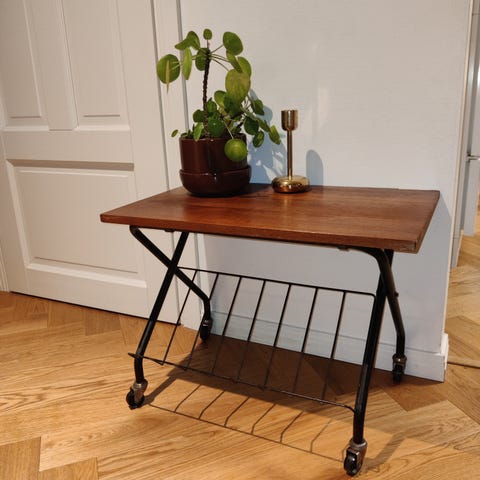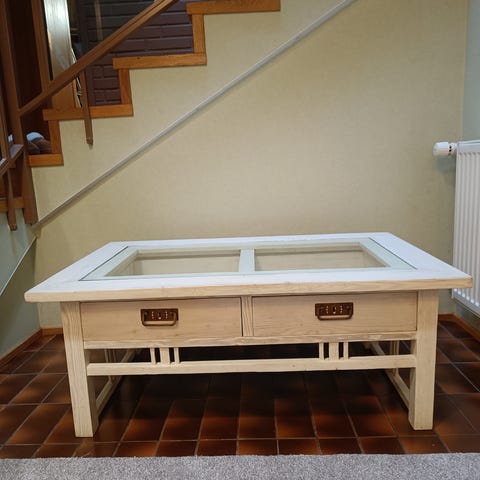Pöytä, korkeus 45, leveys 138, syvyys 44, pöytälevy 4 cm. On tukeva/painava, tehty umpipuusta. Jalat saa irroitettua. Pöydän maalipintapinta kulunut (ei koloja), vaatisi petsauksen, muuten hyväkuntoinen. Jäljittelee antiikkipöytää. Vain nouto