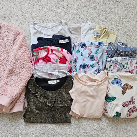 Sisältää kahdet legginsit, kaksi t-paitaa, kolme toppia, fleecetakin, yhden trikoopaidan, kahdet shortsit ja yhdet caprilegginsit.