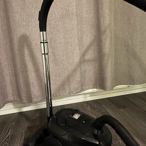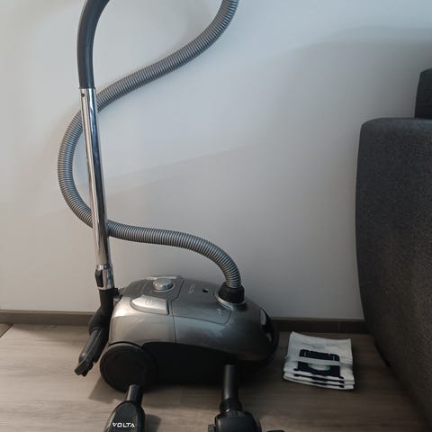 Volta pölynimuri sininen. Pölynimuri sisältää letkun ja suulakkeen.