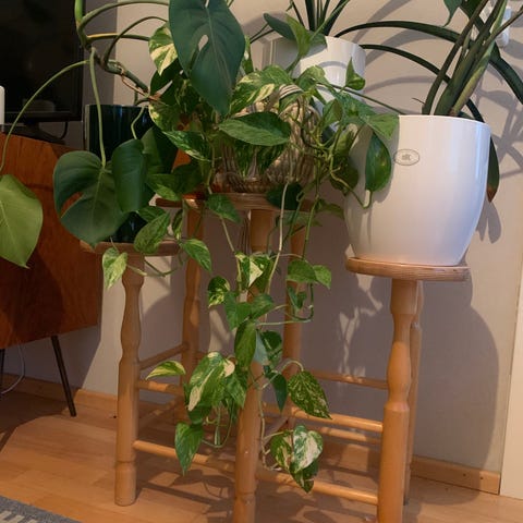 Vanha sorvattu kukkapöytä/ teline kiiltävällä keltaisella maalilla.