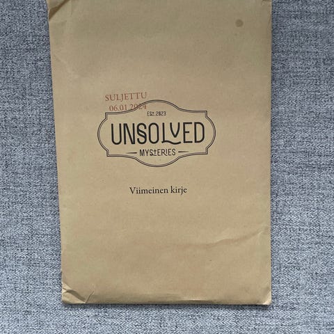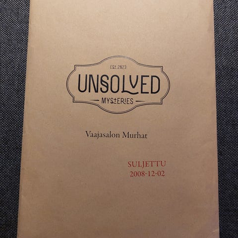 Unsolved Mysteries Vaajasalon Murhat peli. Kerran pelattu, kaikki osat jäljellä ja sisällä kuoressa valmiiksi järjesteltynä uutta peliä varten.