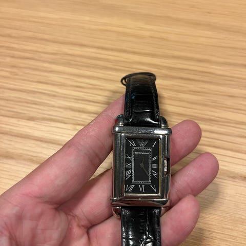Armani unisex rannekello, jossa on musta nahkaranneke ja ranne puoli on valkoinen. Kellon kellotaulu on läpinäkyvä, mikä paljastaa osan kellon mekanismista.Mukana tulee musta kuori kelloa varten