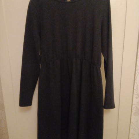 Sinisessä mekossa on leveä malli ja kaksi taskua. Koko L tai 42/44, materiaali 100 % orgaanista puuvillaa.