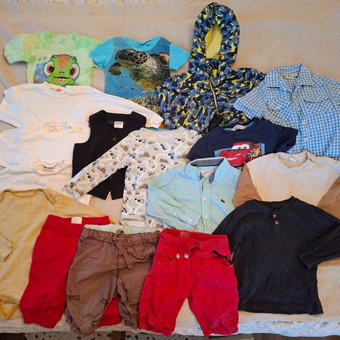 Kolme h&m trikoopaitaa, pilkullisen beigen saa kaupan päälle jos haluaa, siinä pari pientä reikää. Koko 92, mutta sanoisin ennemmin että 86. Hyvä siisti kunto.