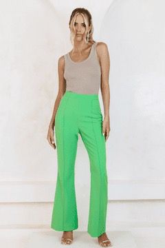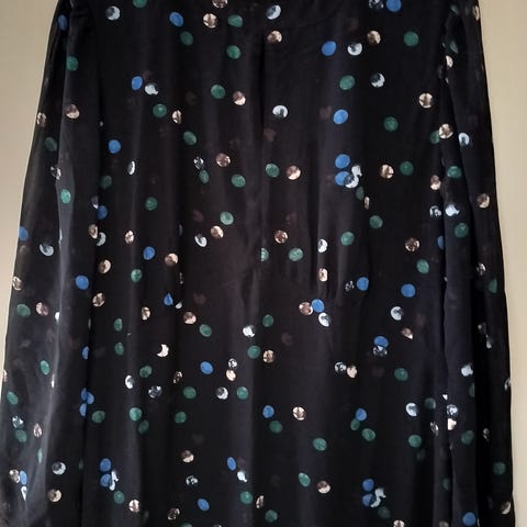 Hieman kimaltavaa viskoosisekoitetta (90 % viskoosi, 10 % polyesteri). Vyötärö n. 45 cm, lahkeen sisämitta n. 76 cm.