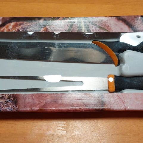 Fiskarsin veitsisetti, veitset ruostumatonta terästä. Sisältää leipä-, kokin- ja vihannesveitsen. Kokinveitsen terässä nirhauma, näkyy viimeisessä kuvassa ja toi