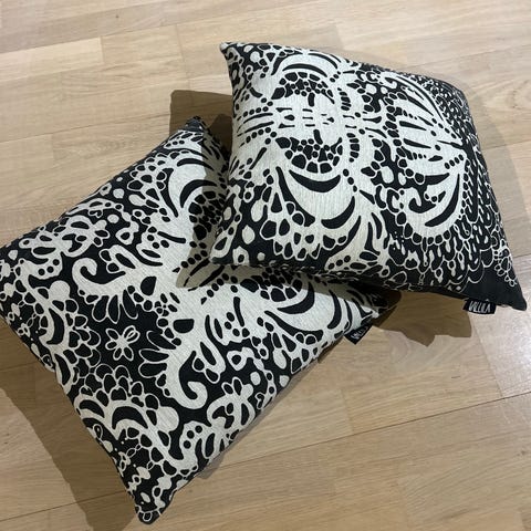 Myydään Vallilan Mandariini sivuverho. Väri on pinkki-musta-valkoinen. Koko 140 x 240 cm. Ylhäällä kuja tangolle / paikat ripustuskoukuille,