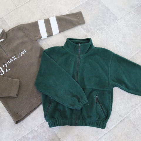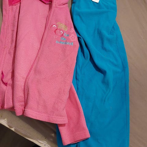 Hyväkuntoiset fleecetakit koossa 122. Housut koossa 120.
