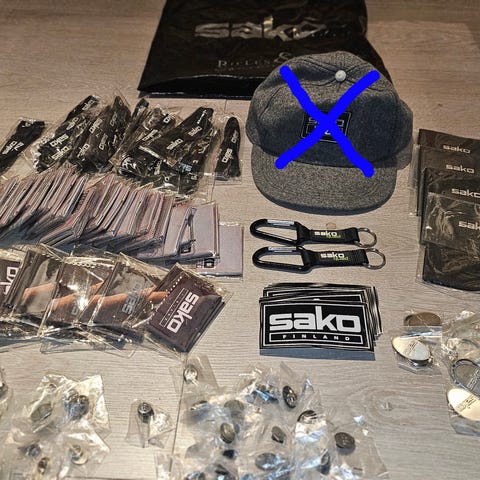Myynnissä eri ilmoituksissa myös iso kasa Tikka ja SAKO pinssejä, tarroja, puhdistusliinoja jne.