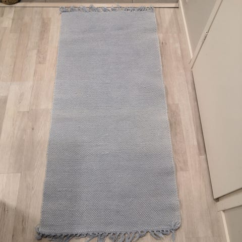 Räsymatto, jossa on punainen ja harmaa väriyhdistelmä. Maton leveys ei säily samana, vaan se on keskeltä leveämpi kuin päistä. Vain nouto.