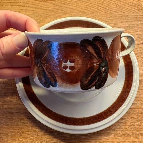 Arabia, iso Rosmarin muki, korkeus 8 cm, halkaisija 10 cm, asetti 16 cm, tilavuus 0,4L. Suunnittelija Ulla Procope, tuotannossa 1961-1972. Käsinmaalattu, signeerattu.