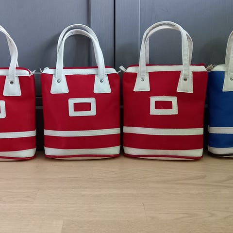 Lapsi myy laukkujaan. Musta käsilaukku, "nahkaa", vetoketjulla suljetaan. 2€