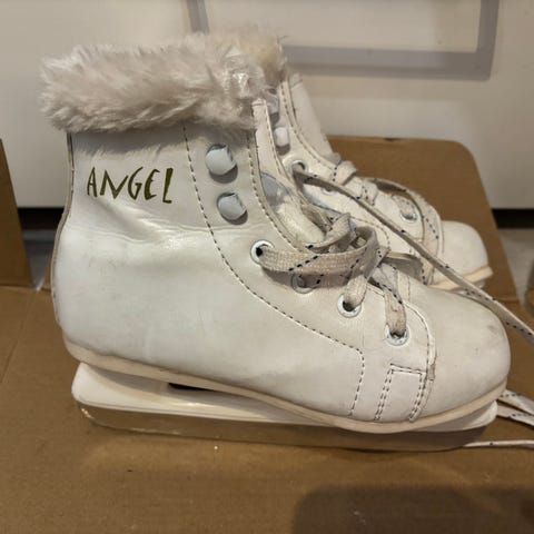 Lasten luistimet, koko 28. Kuluneen näköiset, mutta terää hyvin jäljellä.