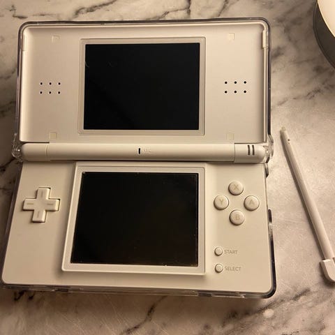 Sisältyy Nintendo DS Lite, laturi, 42 All-Time Classics peli ja kotelo. Kotelon tekonahka on heikossa hapessa.