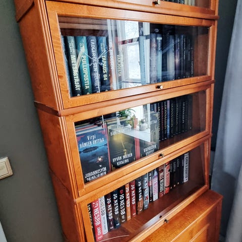 Kirjahylly, jossa lasiovet. Sopii kirjojen, astioiden ja koriste-esineiden säilytykseen. Materiaali lasi ja puu. Väri tumma puu ja läpinäkyvä lasi. Ostettu uutena vuonna 2006 Iskusta.