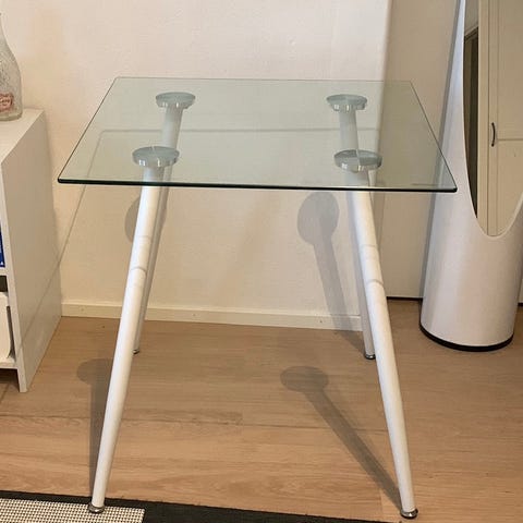 Lasipöytä, jossa on kirkas lasikansi ja valkoiset metallijalat. Ruokapöytä käytössä ollut ja sopii hyvin pienempään keittiöön.