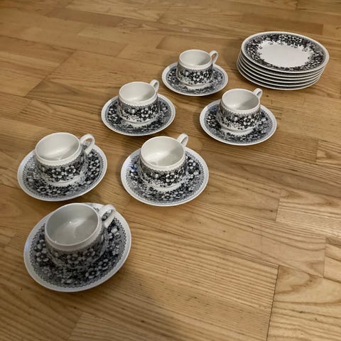 Käyttämätön Talvikki astiasto. Myymättä syvät lautaset 6 kpl, voileipälautaset 6 kpl, pyöreä tarjoiluastia ja kahvikupit. Tee tarjous….