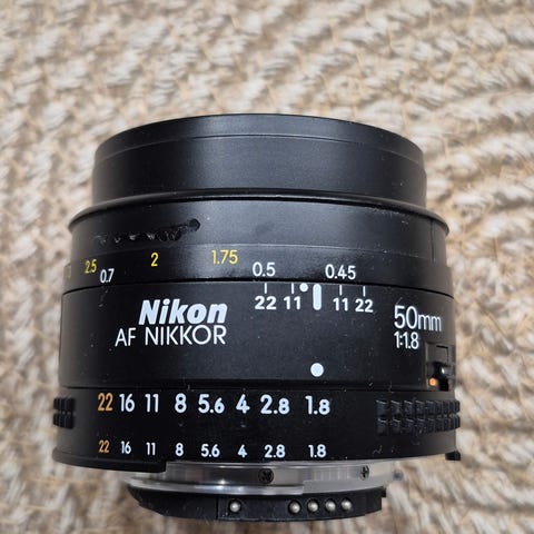 Lähes uudenveroisessa kunnossa oleva Nikkorin standardiobjektiivi hyvällä f/1.8 valovoimalla ja erinomaisella piirrolla.