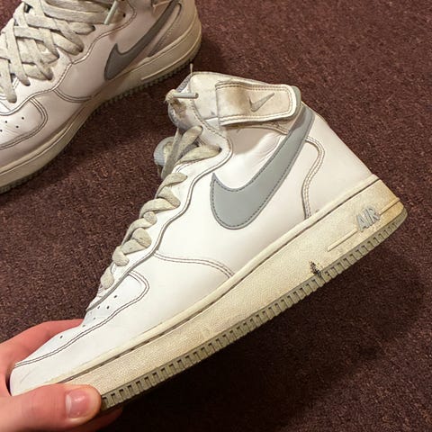 Hyvässä kunnossa olevat legendaariset teinien suosiossa olevat valkoiset niket. Noilla kuljetaan kesät talvet. Vasemmassa kengässä pieni jälki jota en saanut pestessä pois. Pohjat ehjät, näissä malleissa pohjat kuluu puhki kun paljon käyttää. Turha ostaa uusia, koska uudet ei oo muotia. Tästä suoraan jalkaan ja kohti seikkailuja.