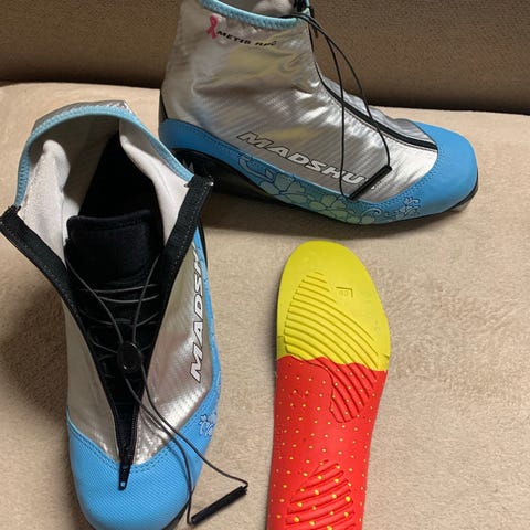 Madshus Metis Rpc monot NNN-siteisiin, koko 35 pohjallisen pituus kantakupista kärkeen n. 21,8 cm. Vaaleansiniset, suojakangas hopeinen, suojakankaassa on käytön jälkiä.