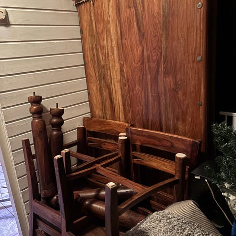 Ei kuvan pöytä, neljän hengen pöytä ja 7kpl tuoleja mukaan