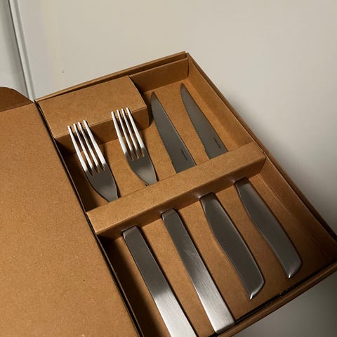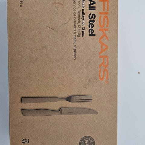 Avaamattomassa paketissa oleva uusi Fiskarsin All Steel- ruokailuvälinesetti. Sisältää haarukat, veitset, isot lusikat ja pikkulusikat, kaikkia 6kpl.