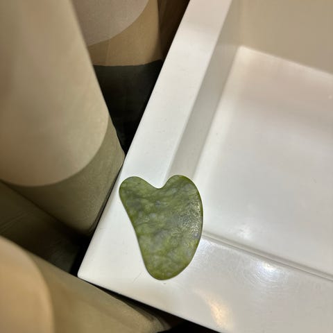 Kuvan guasha kasvorulla ja hierontakivi ruusukvartsia kauniissa pussukassa, lahjaksi saatu, uudet ja käyttämättömät.