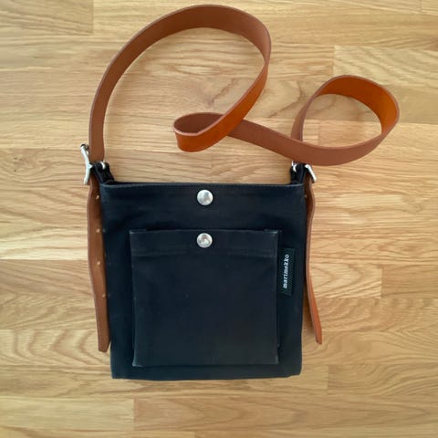 Marimekko kangaskassi unisex, musta kangas ja ruskea olkahihna. Kassi on varustettu etutaskulla, jossa on läppä ja painonappi. Sopii arkipäivän käyttöön ja tavaroiden kuljettamiseen.