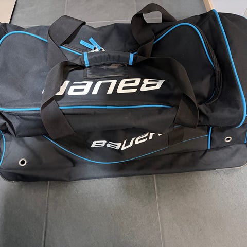 Bauer Jääkiekko reppu/vetokassi pyörillä. Laukussa on vetokahva ja pyörät helpottamaan kuljetusta. Vetokahva ei enää pysy ylhäällä itsestään, mutta ei vaikuta vetämiseen.