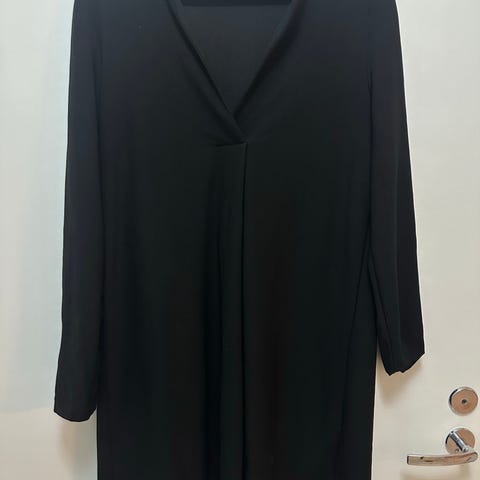 Mango musta trikoomekko, jossa alla viskoosinen vuorimekko. Koko S. Käyttämätön, laput paikallaan. Kauluksessa rypytystä, samoin vyötärön kohdalla. Pitkät hihat.