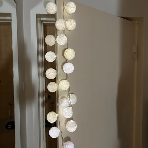 Jysk koristevalosarja, jossa on pyöreitä valkoisia palloja. Valosarja soveltuu käytettäväksi eri vuodenaikoina sisätiloissa. Valaisimet on suunniteltu koristekäyttöön.