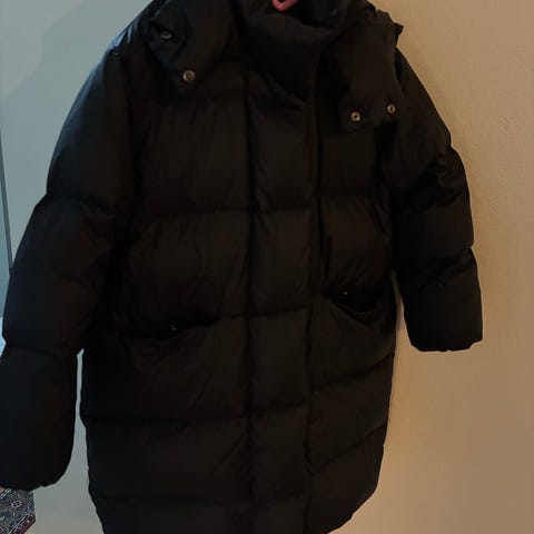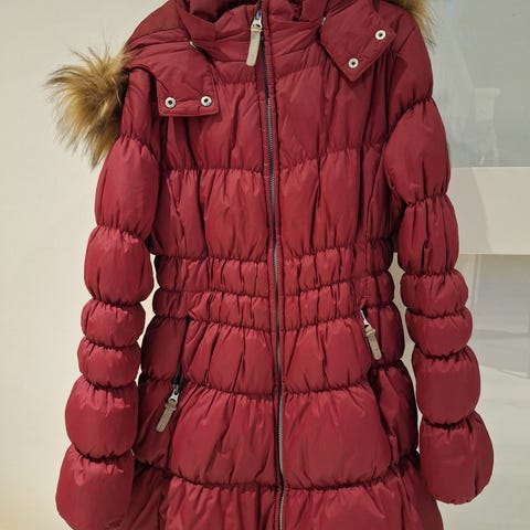 Erittäin muhkea untuvatakki kunnon pakkaseen. Koko 130. Irrotettava huppu. Hupussa karvareunus. Ilmeisesti aitoa turkista. Vetoketju toimii moitteetta. Niskassa olevista hupun napeista yksi revennyt hieman. Parissa hupun napinlävessä hieman liian iso napinläpi, mutta en ole itse saanut aikaiseksi laittaa niihin paria pistoa ja pienentää niitä.