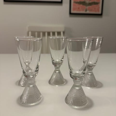 Wirkkala Tapio snapsilaseja pienemmän korkeus n. 8 cm, isommat n. 11 cm. Wirkkalan Tapio minisnapsilasit ja snapsilasit. 4+4.