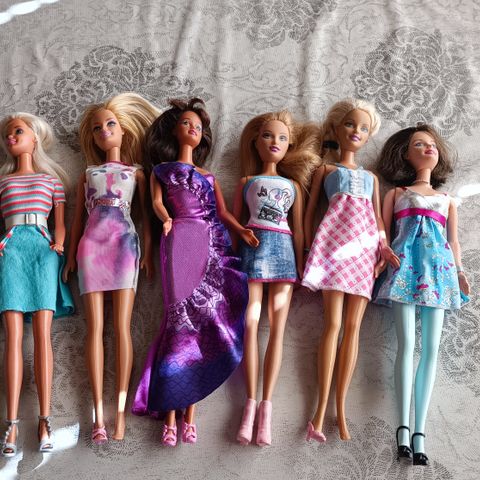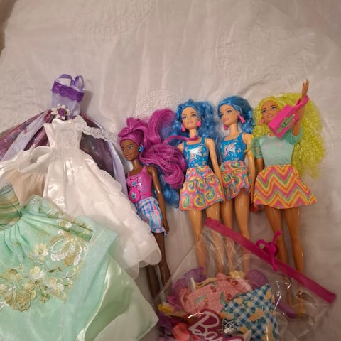 Barbie nukkeja, vaatteita, kenkiä yms ja pari keittiön kalustetta.