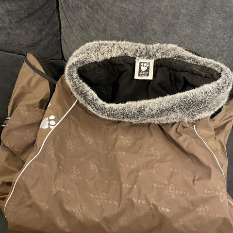 Ihanan pehmeä veloursamettinen mantteli, selän pituus 26 cm. Sisällä trikoovuori ja kiinnitys tarroilla kyljistä. Käyttämätön, kun oli liian iso meidän koiralle. Sopii rintavalle koirarodulle.