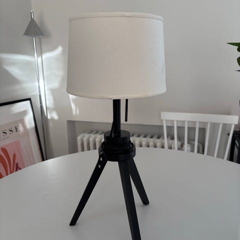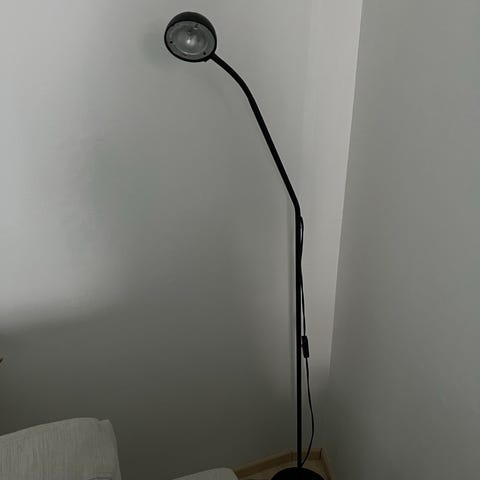 Harmaa, n. 40cm korkea yksinkertainen jalkalamppu. Kuvussa likaa, ks. Kuvat.